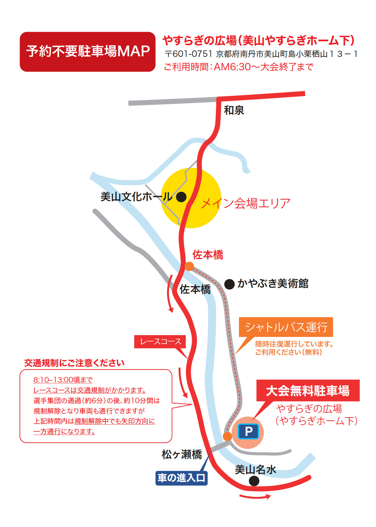 事前に予約されていない方、観戦の方は、すべて会場から1.5キロ離れた「やすらぎの広場」駐車場をご利用ください。無料です。